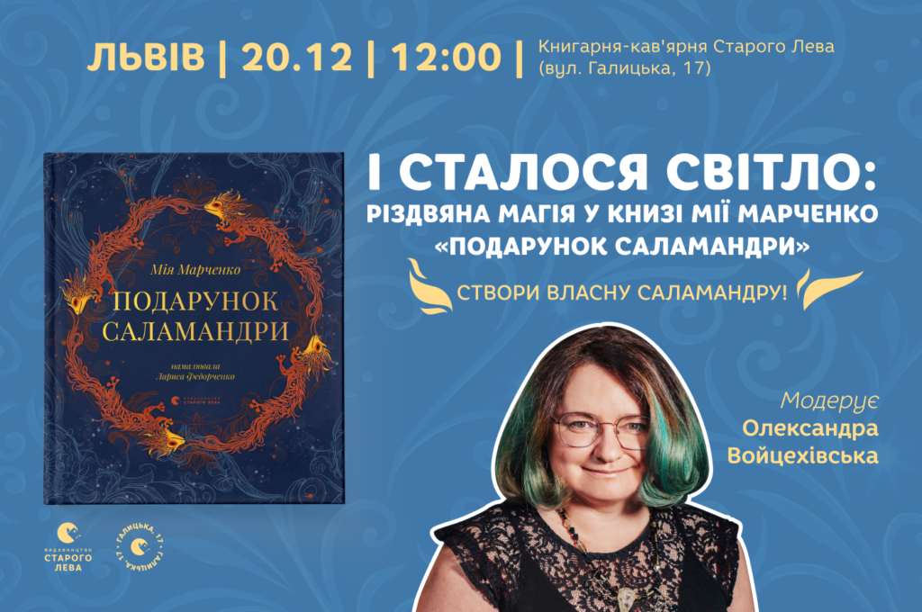 20 грудня о 12:00 у книгарні-кав’ярні Старого Лева у Львові (вул. Галицька, 17) відбудеться презентація нової книги Мії Марченко «Подарунок Саламандри». Модераторуватиме зустріч письменниця та блогерка Олександра Войцехівська. Про це повідомило Видавництво Старого Лева, пише Четверта студія. Під час події говоритимемо про сучасні різдвяні казки, про роль магії у складні часи та про героїв, які вчаться керувати власним світлом. У межах зустрічі учасники також зможуть створити власну саламандру! Про книгу «Подарунок Саламандри» — магічна різдвяна історія про дівчинку Сорайю, яка вміє керувати вогнем. Вороги розлучають Сорайю з батьками, і вона опиняється в цирку. Її друг, акробат Зеф, підтримує її, та коли дівчинка відкриває йому свій секрет, їхні життя опиняються під загрозою. Залишившись сама-самісінька в серці захопленої ворогами столиці, Сорайя обирає застосувати свою магію, щоби врятувати Зефа, знайти свою сім’ю, а також допомогти містянам вибороти свободу! Про авторку Мія Марченко — українська письменниця, перекладачка та літературознавиця, кандидатка філологічних наук. Захоплюється міськими текстами, магією рослин і київськими двориками.