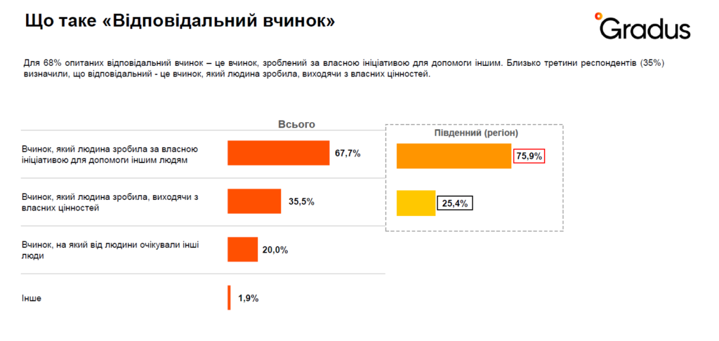 Gradus Research Company та ЦЕДЕМ додатково проаналізували, як українці розуміють поняття «відповідальний вчинок». Найбільша кількість респондентів погоджується, що це дії з власної ініціативи для допомоги іншим (68% респондентів). Така точка зору особливо домінує серед мешканців південних областей.