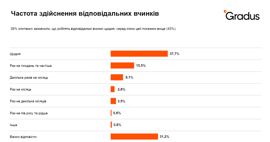 16% респондентів роблять відповідальні вчинки раз на тиждень, 8% — раз на місяць, третині українців було важко відповісти на це питання. Цікаво, що жінки вважають себе більш сумлінними за чоловіків у цьому питанні (43% vs 31%), а молоде покоління частіше обмежується одним відповідальним вчинком на тиждень (32% опитаних обрали цей варіант).