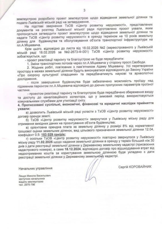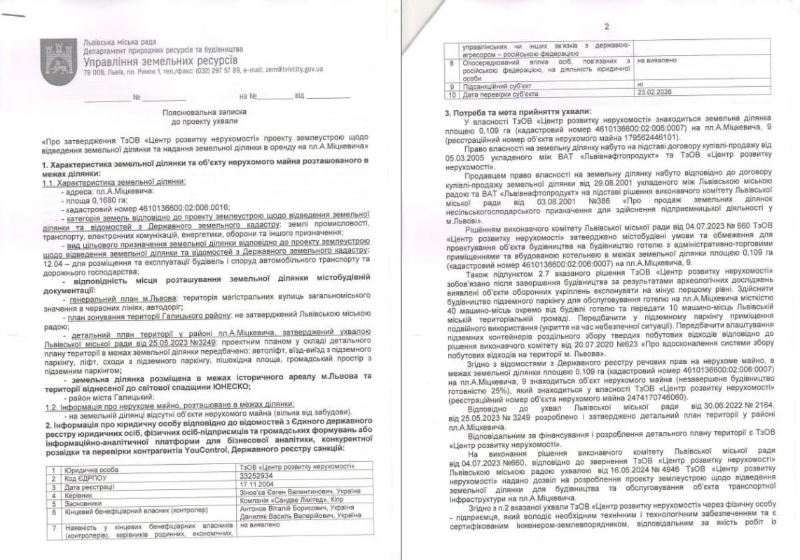 У Львові знову витягнули з шухляд скандальний проєкт ухвали, який може остаточно змінити вигляд і транспортну логіку історичного центру на догоду іменитому інвестору. Попри протести архітекторів, застереження геологів та реальну загрозу руйнування сусідніх будівель, ТзОВ «Центр розвитку нерухомості», що належить бізнесмену Віталію Антонову, знову опинилося за крок до отримання землі на площі Адама Міцкевича.