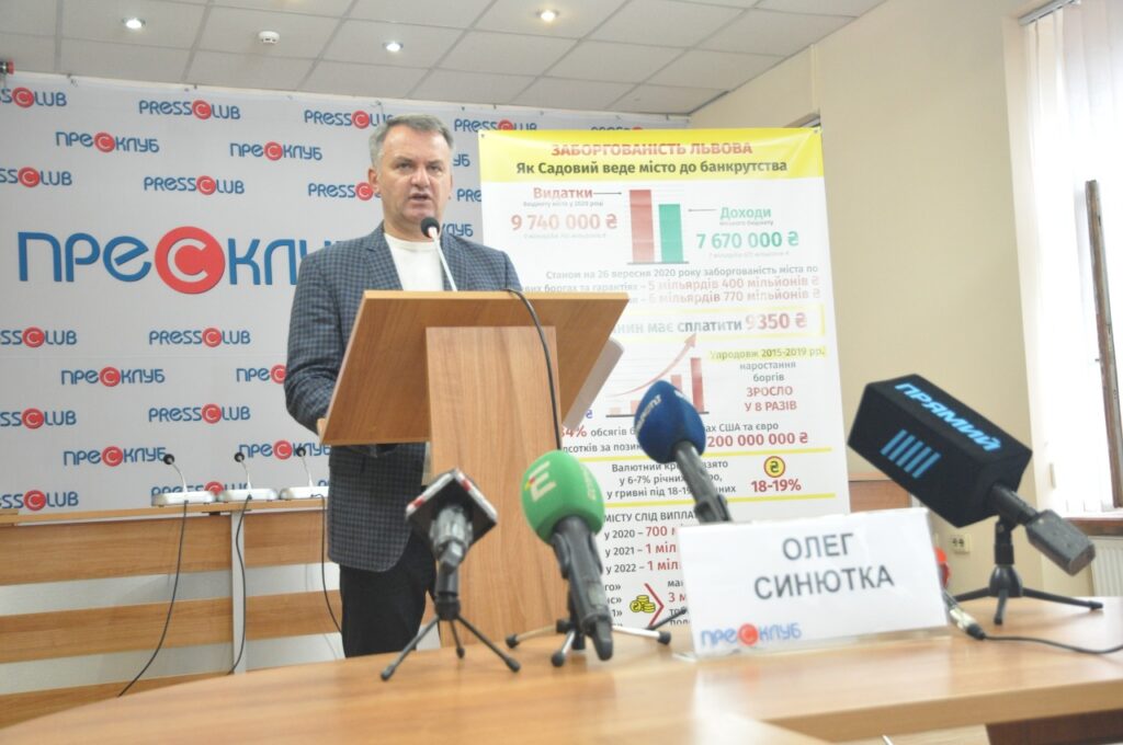 «Міська влада гроші в кредити бере, а щоб їх віддати, кожен львів’янин – від найменшого до найстаршого – має сплатити 9 350 гривень! Станом на 26 вересня 2020 року заборгованість міста по місцевих боргах та гарантіях складає величезні 5 мільярдів 400 мільйонів гривень. Якщо ж додати відсотки, які треба буде сплатити за користування цими кредитними коштами, то це вже, 6 мільярдів 770 мільйонів гривень», – сказав Синютка.