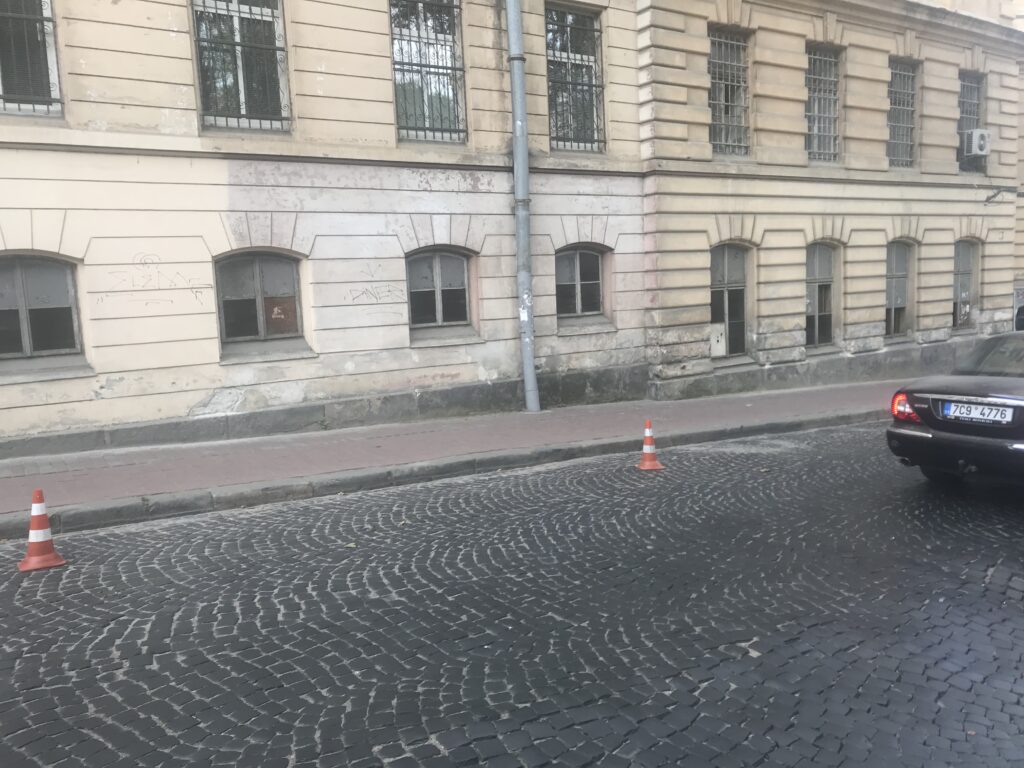 Біля стіни управління міліції стоять трикутники, які забороняють водіям паркуватися.