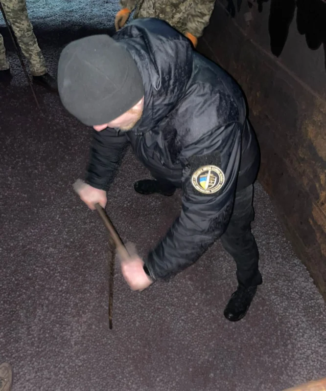 Відтак за допомогою ліхтарика, металевих щупів та лопат виявлено приховані 152 блоки сигарет «Compiment» без марок акцизного збору України. Для кращого маскування їх заздалегідь загорнули у чорну поліетиленову плівку та закопали глибоко під шаром окатишів.