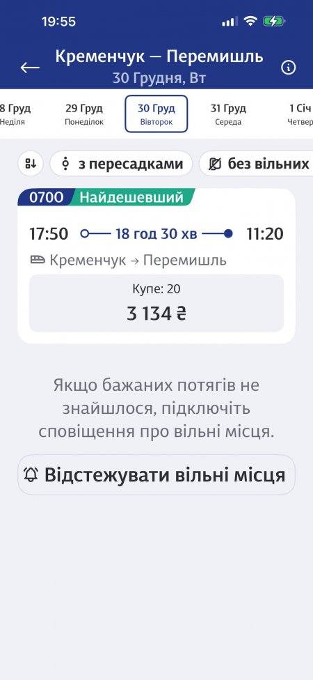 Якщо ж їхати з Кременчука безпосередньо до Перемишля, вартість квитка становить 3134 гривні. Поїзд вирушатиме з Кременчука о 17.50, а прибуватиме до Перемишля об 11.20 наступного дня. Час у дорозі становитиме 18 годин 30 хвилин.