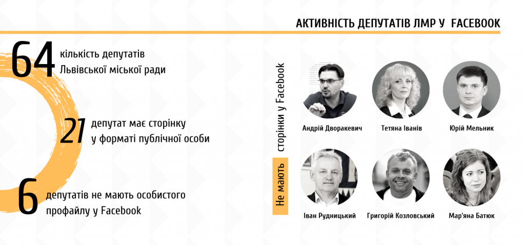 Так, згідно нашого аналізу лише 6 з 64 депутатів не мають власної сторінки на Facebook. Це Григорій Козловський (БПП “Солідарність”), Іван Рудницький (БПП “Солідарність”), Мар’яна Батюк (ВО “Свобода”, видалила після скандального допису про Гітлера), Андрій Дворакевич (Об’єднання “Самопоміч”), Тетяна Іванів (Об’єднання “Самопоміч”) та Юрій Мельник (Об’єднання “Самопоміч”). Ще у двох депутатів – Романа Федишина (Об’єднання “Самопоміч”) і Юрія Кужелюка (“Громадянська позиція”) – профайли існують, проте протягом кількох років вони залишаються неактивними.