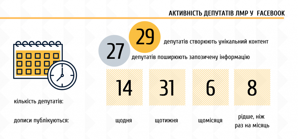 Моніторинг активності депутатів у соціальних мережах дозволяє робити певні висновки і про частоту інформування. Так, щодня можна побачити публікації у Михайла Дідуха, Ірини Оршак, Віталія Свінціцького (Народний контроль), Мирослава Данилківа, Ігоря Дяковича, Юлії Гвоздович (Українська Галицька Партія), Ігоря Телішевського, Богдана Гули, Ігоря Зінкевича (УКРОП), Вікторії Довжик, Ольги Посипанко, Оксани Рубай, Юлії Хомчин та Андрія Шевціва (Об’єднання “Самопоміч”). Практично у половини, а саме – у 31 депутата – Уляни Пак, Романа Грицевича, Остапа Доскіча, Сергія Іваха, Віталія Свіщова (БПП “Солідарність”), Володимира Гринишина, Тараса Гупало, Андріяна Гутника, Андрія Карбовника, Андрія Рікоти, Дмитра Чуниса (ВО “Свобода”), Валерія Веремчука, Тараса Ворко, Анни Мармуляк (Народний контроль), Тараса Чолія (Українська Галицька Партія), Романа Іванціва, Назара Палідовича (Громадянська Позиція), Любомира Босаневича, Богдана Гули (УКРОП), Олега Берези, Орисі Богун, Любови Давидович, Оксани Динік, Богданни Зубрицької, Тараса Кльофи, Христини Паньків, Андрія Пундора, Ігоря Стояновського, Андрія Шевціва, Олега Шміда (Об’єднання “Самопоміч”) – сторінки наповнюються інформацією щотижня. Мінімум щомісячна активність в мережі спостерігається за Петром Адамиком, Юрієм Моравецьким (БПП “Солідарність”), Олегом Сорочкіним (Громадянська позиція), Іваном Гриндою (УКРОП), Максимом Колядою, Ігорем Корончевським (Об’єднання “Самопоміч”). Рідше, аніж раз на місяць з’являються дописи у 8 обранців, а саме у Володимира Роп’яка (БПП “Солідарність”), Маркіяна Лопачака (ВО “Свобода”), Юрія Кужелюка, Ігоря Ваня, Ірини Сердюк (Громадянська позиція), Олега Василишина, Володимира Крицака та Романа Федишина (Об’єднання “Самопоміч”).