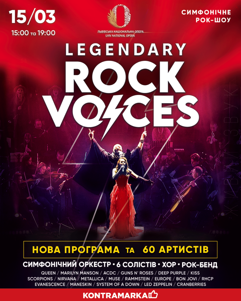 У суботу, 15 березня, в Львівській національній опері відбудеться унікальне рок-шоу світового рівня Legendary Rock Voices у супроводі симфонічного оркестру. Ця грандіозна концертна програма — це поєднання потужної рок-енергії та величі симфонічного звучання у виконанні 60 артистів на одній сцені. Того дня відбудеться два шоу поспіль — на 15:00 та 19:00.
