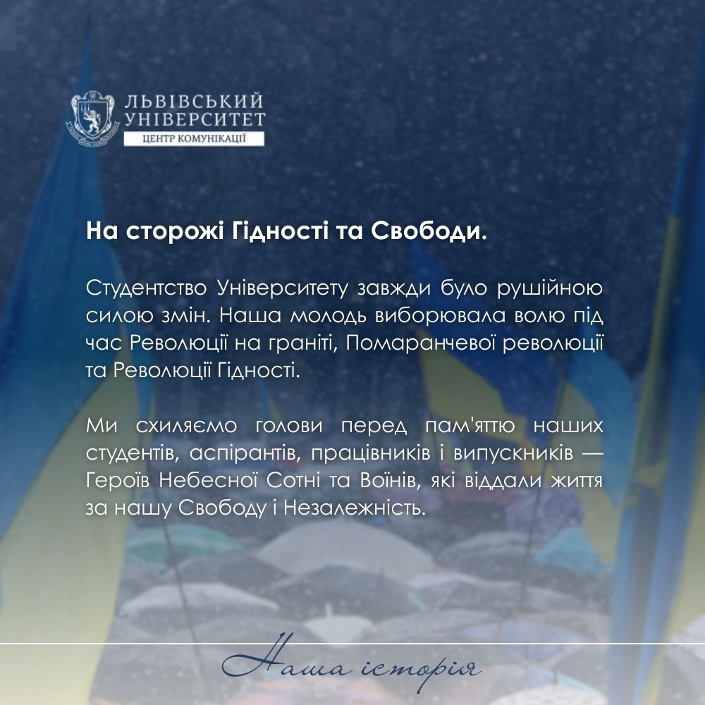 Наша історія закарбована в іменах тисяч особистостей, у численних наукових відкриттях, унікальних культурних надбаннях, прогресивних освітніх реформах, у боротьбі за Свободу і Незалежність. Ми вдячні кожному поколінню студентів, працівників та випускників Університету за цей фундамент.
