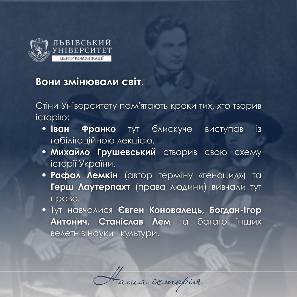 “Тут навчалися та гартували дух Іван Франко, Маркіян Шашкевич, Євген Коновалець, а також видатний правник світового масштабу – Рафаель Лемкін. У цих стінах викладали та творили науку Михайло Грушевський, фундатори львівської математичної школи Стефан Банах та Гуго Штайнгауз, засновник української географії Степан Рудницький, винахідник вакцини проти тифу Рудольф Вайгль.