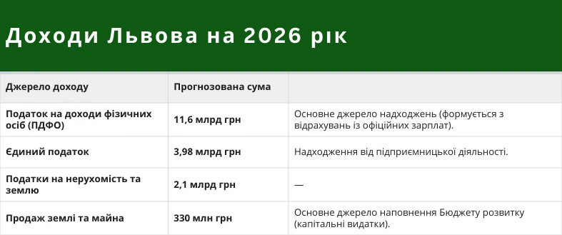 Близько 80% основи бюджету формують два ключові джерела. Головним із них залишається податок на доходи фізичних осіб (ПДФО), який сплачується з офіційних зарплат: прогноз надходжень складає 11,6 млрд грн. Другою вагомою частиною є єдиний податок від підприємницької діяльності, від якого очікують отримати 3,98 млрд грн.