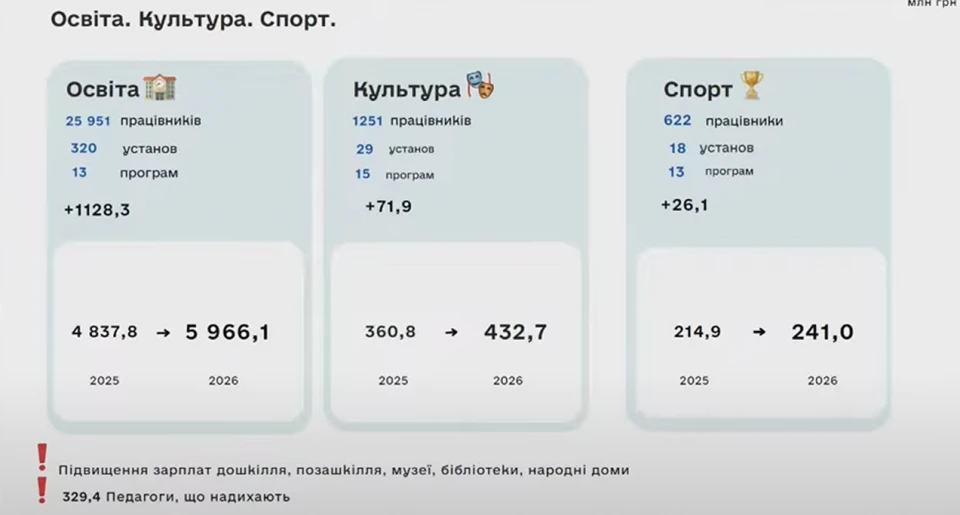 Суттєве збільшення фінансування передбачено для гуманітарного блоку. Беззаперечним пріоритетом залишається освіта, бюджет якої у 2026 році зросте на понад 1,1 млрд грн і сягне майже 6 млрд грн (5 966,1 млн грн). У цій сфері працює майже 26 тисяч людей у 320 установах. Левову частку додаткових коштів спрямують на підвищення зарплат працівникам дошкілля та позашкілля, а також на програму преміювання “Педагоги, що надихають”, на яку заклали 329,4 млн грн.