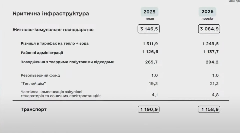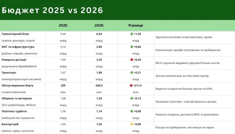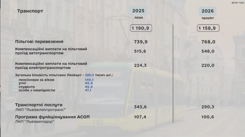 На транспорт та дорожнє господарство передбачено понад 1,88 млрд грн. Левову частку фінансування — 768 млн грн — з’їдає компенсація за пільговий проїзд (548 млн грн на автотранспорт та 220 млн грн на електротранспорт). Для міського бюджету це значно більше навантаження, ніж торік: у 2025 році на ці ж потреби закладали близько 670 млн грн. Тобто за один рік вартість забезпечення пільг для громади зросла майже на 100 мільйонів гривень.