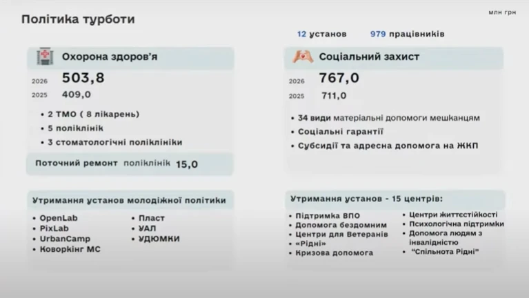 Окремим пріоритетом бюджету є напрям “Політика турботи”, який охоплює медицину та соціальний захист. Видатки на охорону здоров’я у 2026 році зростуть майже на 100 млн грн — з 409 млн грн до 503,8 млн грн. Ці кошти розподілять між двома територіальними медичними об’єднаннями (ТМО), поліклініками та стоматологіями, причому 15 млн грн цільовим призначенням виділено на поточний ремонт поліклінік.