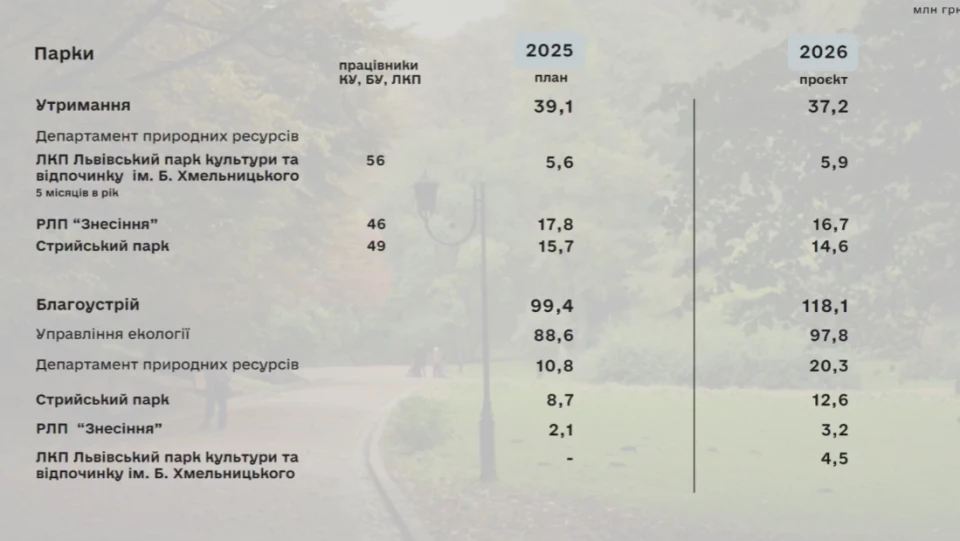 На забезпечення роботи вуличних ліхтарів та утримання електромереж у 2026 році передбачено 187 мільйонів гривень, що на 37 мільйонів більше, ніж торік. Натомість єдиною великою сферою благоустрою, яка втратила фінансування, стали міські парки. На догляд за зеленими зонами у 2026 році виділили 118 мільйонів гривень, що на 15 мільйонів менше від запланованого на 2025 рік.