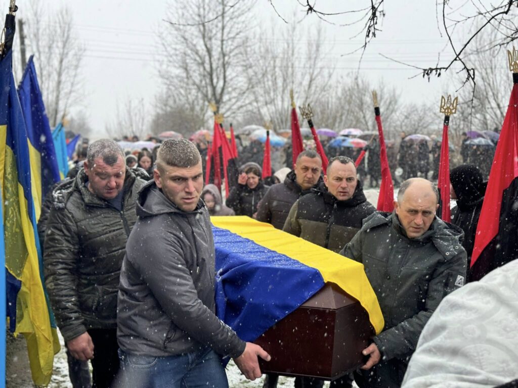 Жителі громади, разом із родиною, друзями, духовенством та представниками влади, сформували живий коридор та, стоячи на колінах, вшанували траурний кортеж із тілом полеглого захисника.