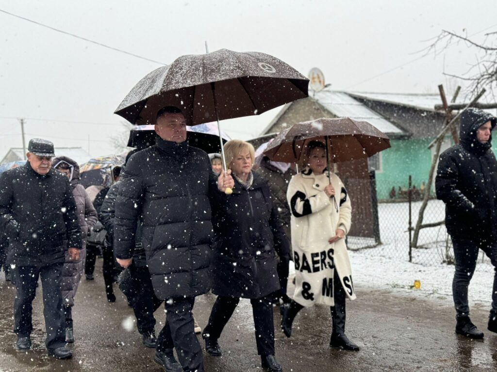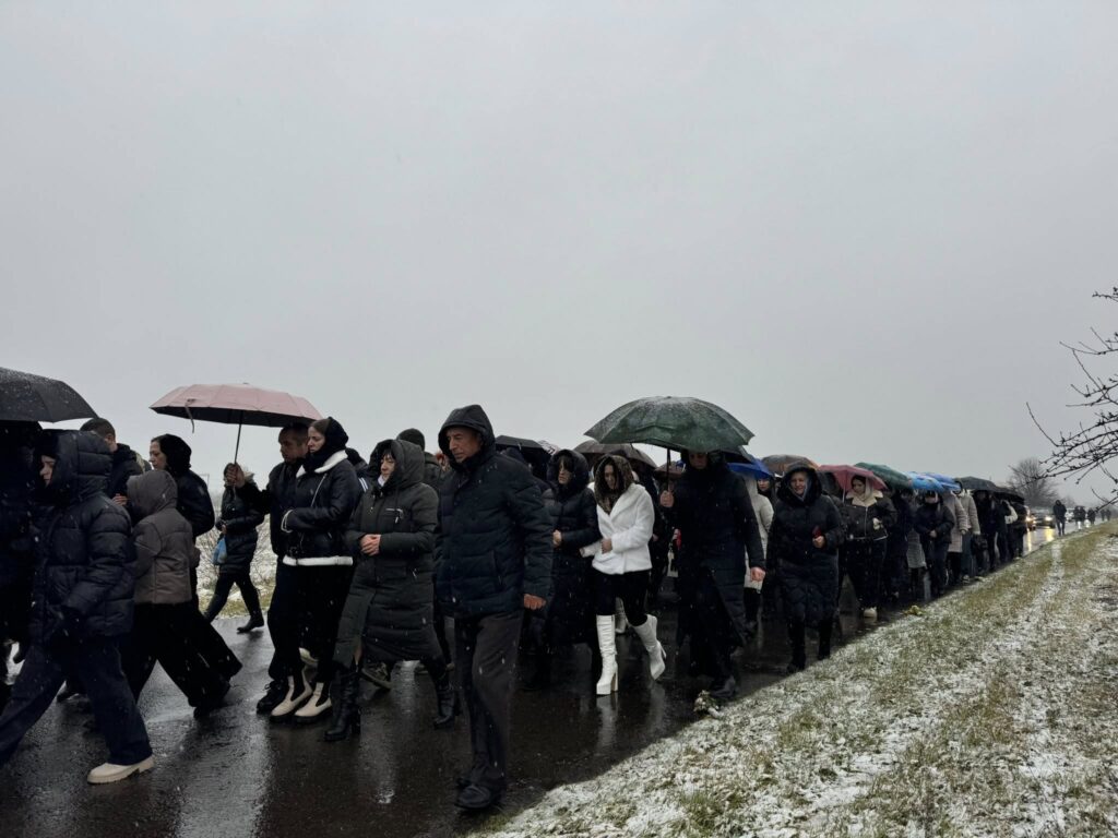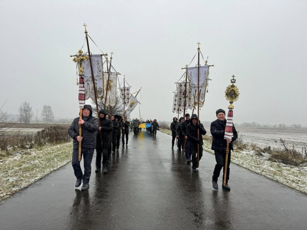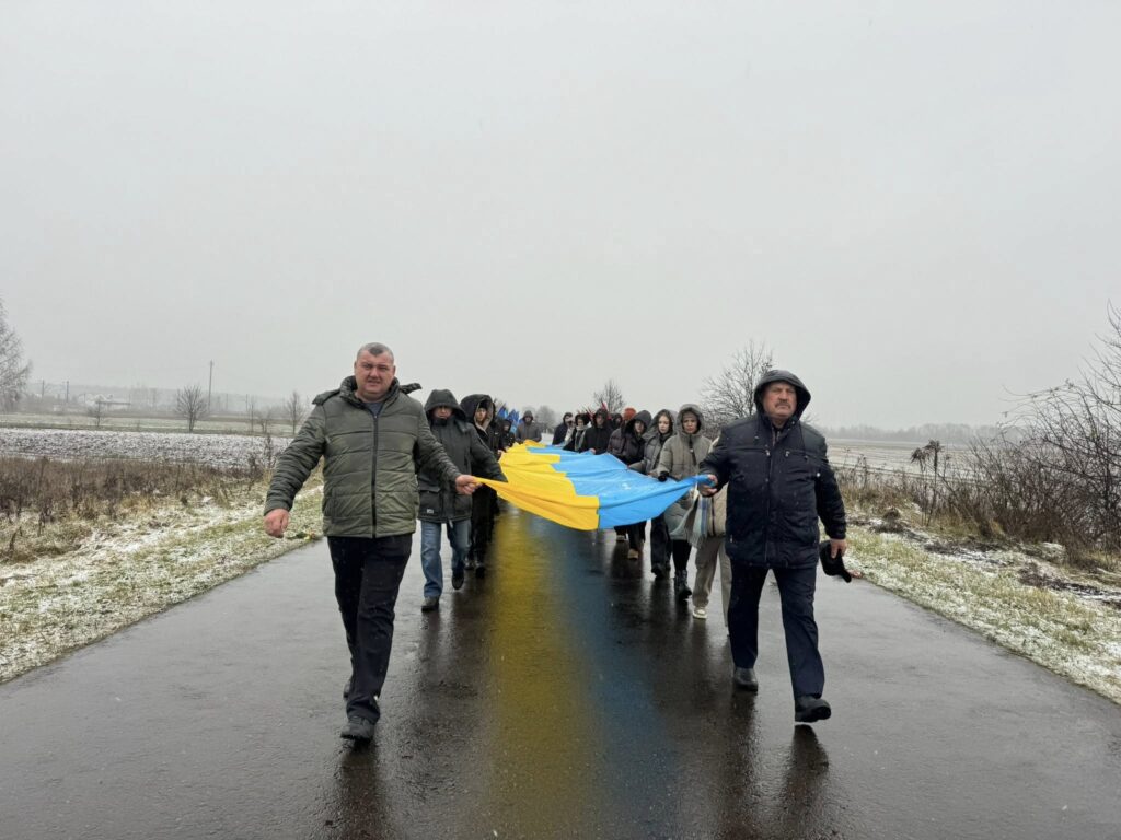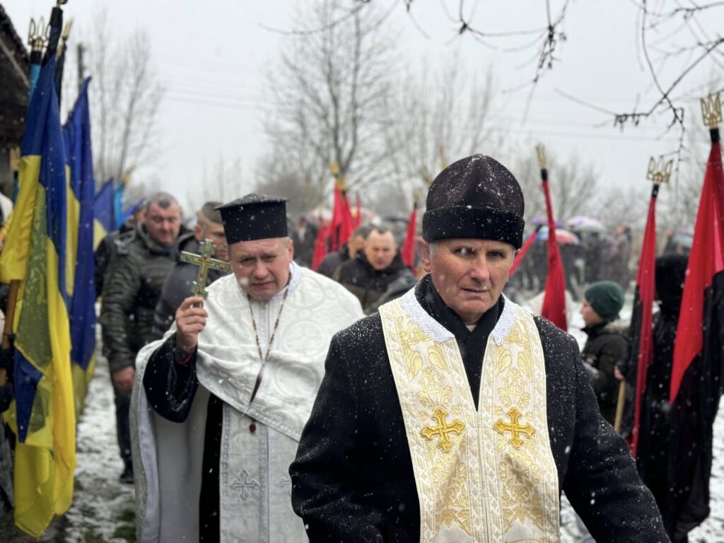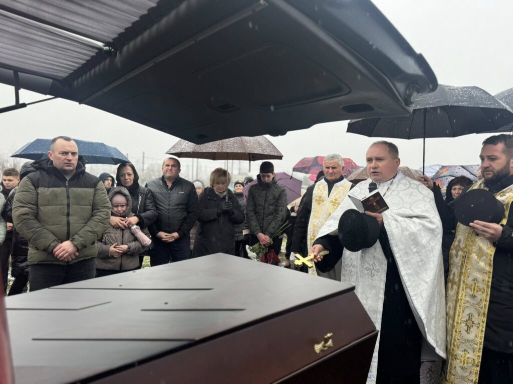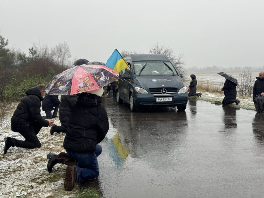 Жителі громади, разом із родиною, друзями, духовенством та представниками влади, сформували живий коридор та, стоячи на колінах, вшанували траурний кортеж із тілом полеглого захисника.
