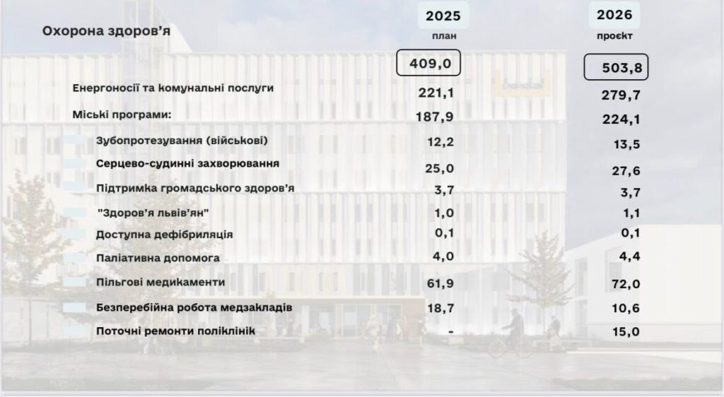 (зубопротезування військових, серцево-судинні захворювання, «Здоров’я львів’ян», дефібриляція, пільгові медикаменти та ін.).