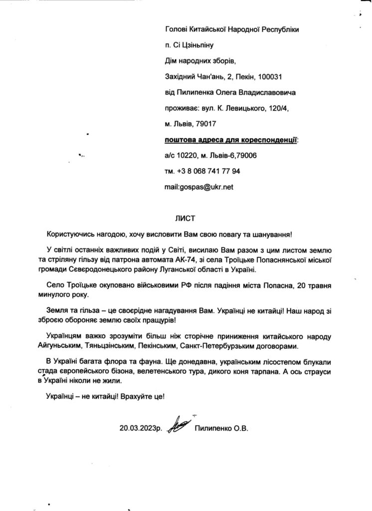 «У світлі останніх важливих подій у Світі, висилаю Вам разом з цим листом землю та стріляну гільзу від патрона автомата АК-74, зі села Троїцьке Попаснянської міської громади Сєвєродонецького району Луганської області в Україні.