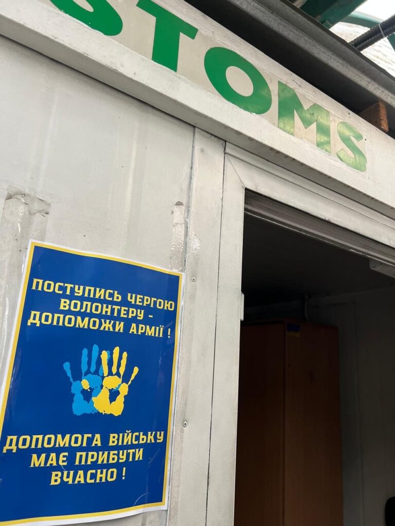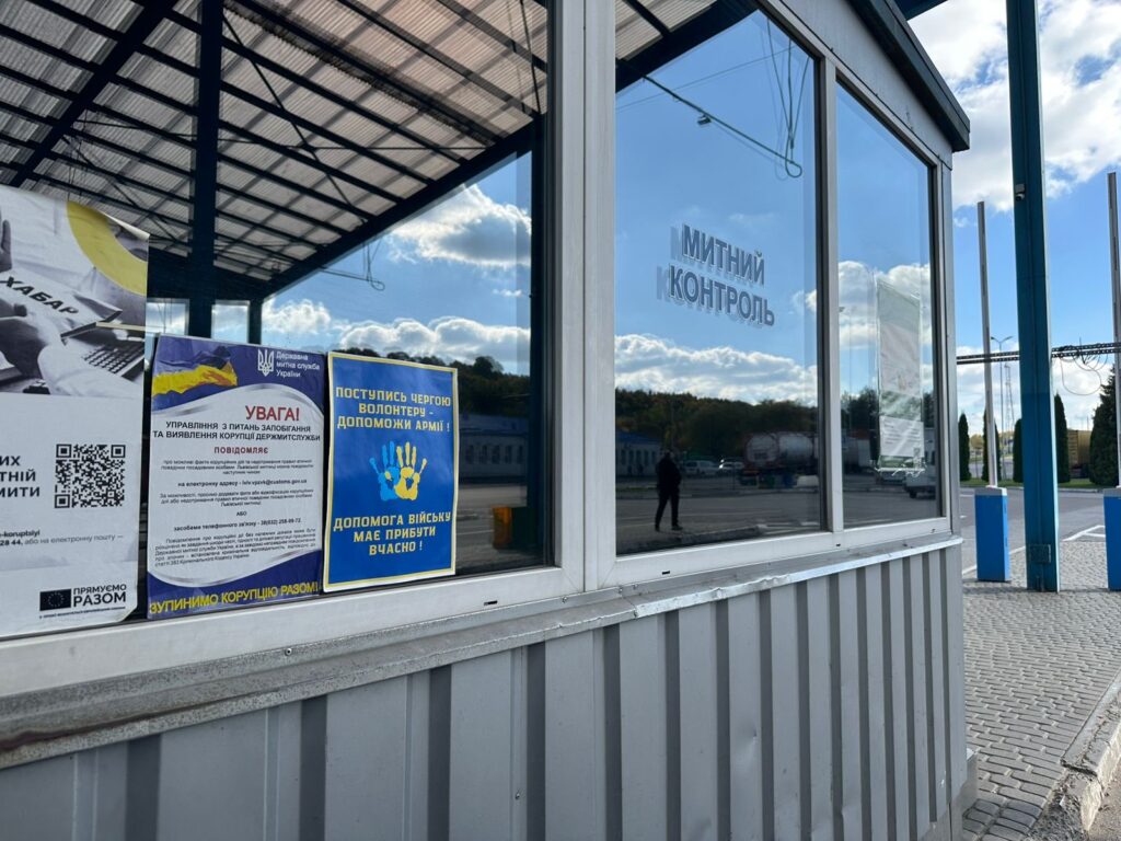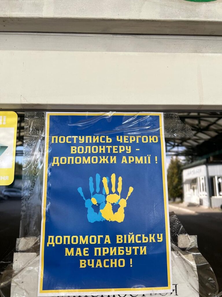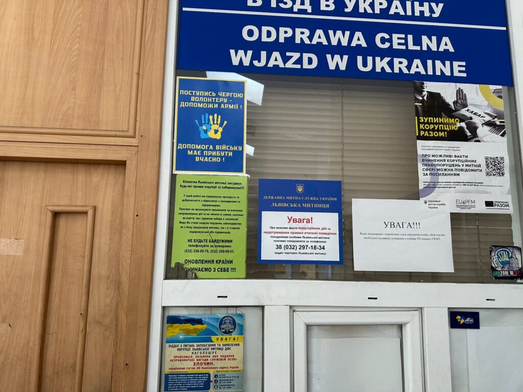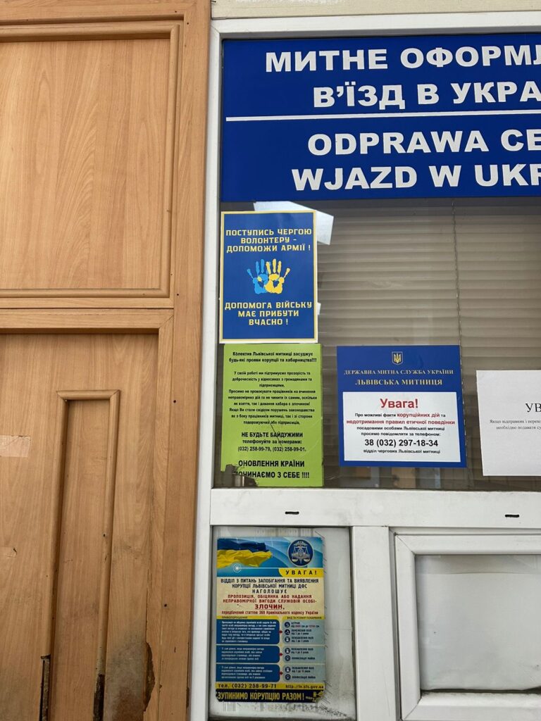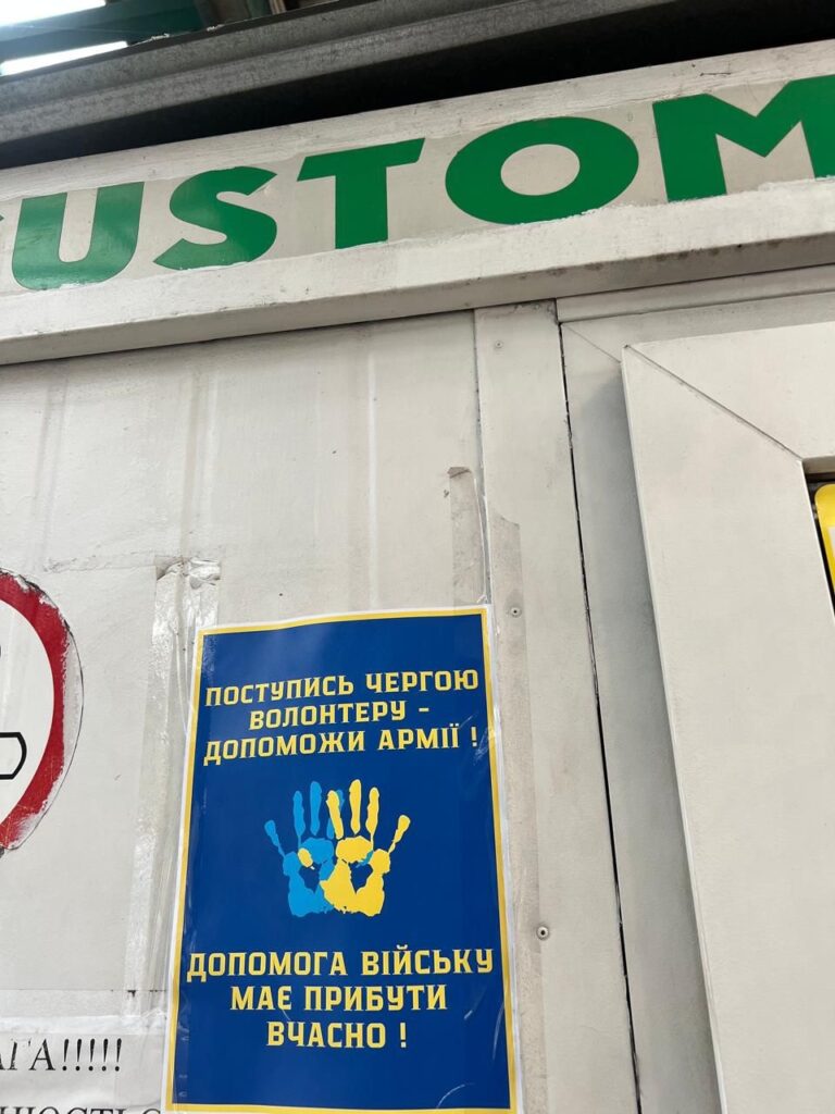 Плакати з написами “Поступись чергою волонтеру – допоможи армії! Допомога війську має прибути вчасно!” є в кожному пункті пропуску на Львівщині на кордоні з Польщею.