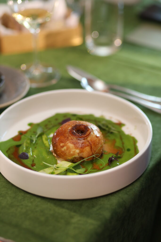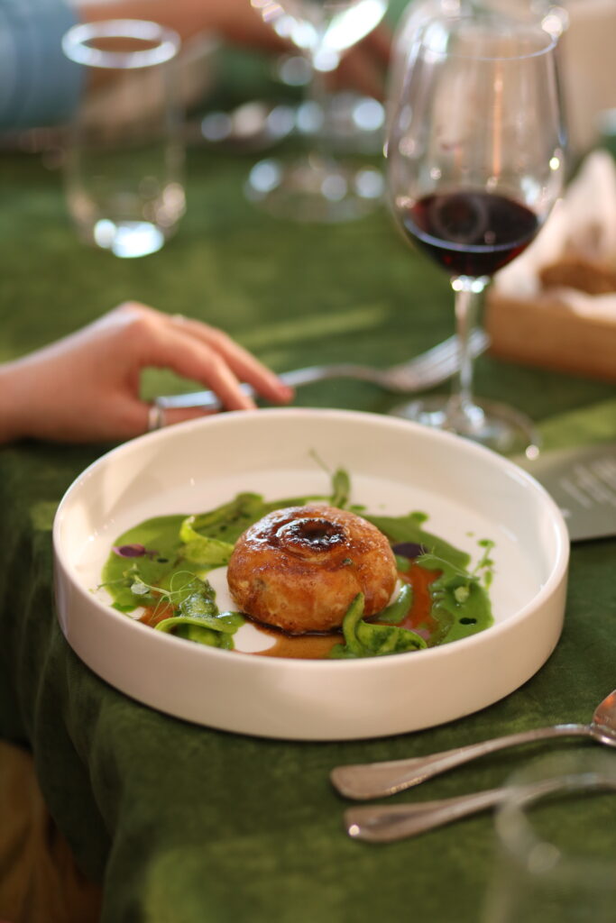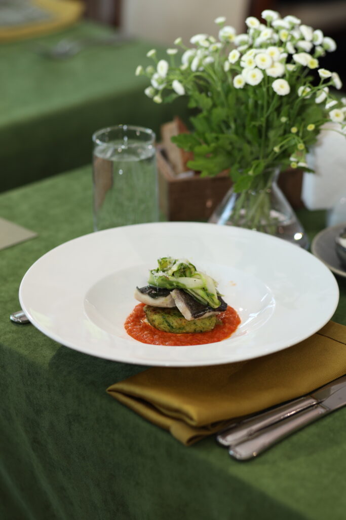 - Судак в стилі котлети по-київськи, молодий горошок, крем селери, біск з чорноморської креветки.