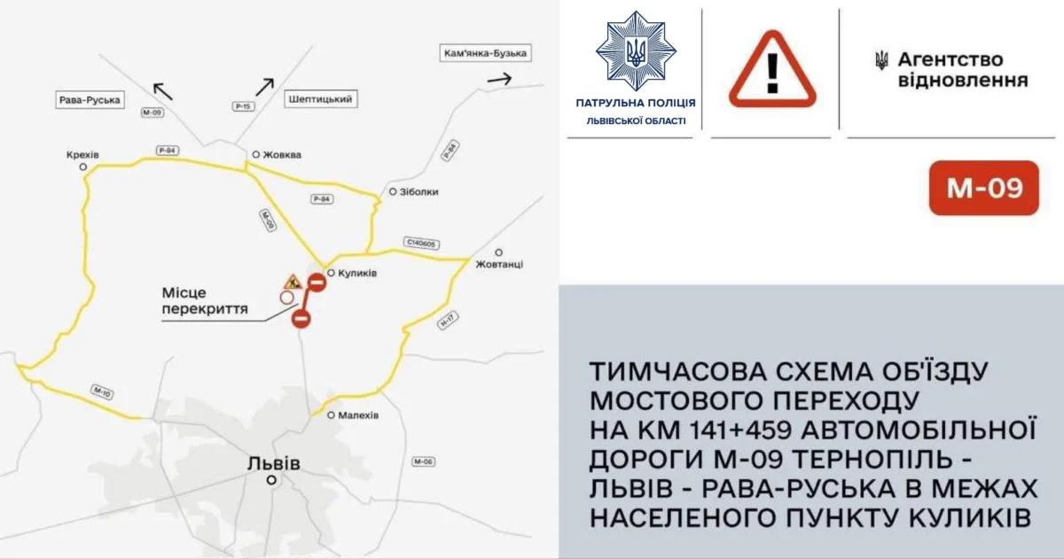 На Львівщині рух мостом на автодорозі М-09 Тернопіль — Львів — Рава-Руська (в межах смт. Куликів) тимчасово перекритий.