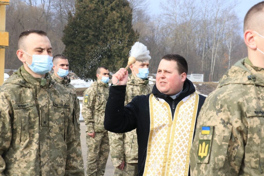 Офіцерське поповнення також отримало благословення на добру службу від військового капелана Національної академії отця Андрія Хомишина, який разом з отцем Юрієм Балухом окропив їх свяченою водою. Музичне привітання на адресу випускників пролунало від оркестру 184-го Навчального центру, який також входить до складу Національної академії сухопутних військ. Військові музиканти продемонстрували винуватцям та гостям свята святкове дефіле.