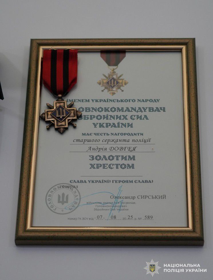 «Андрія нагородили відзнакою Національної поліції України «Знак Пошани» та нагрудним знаком Головнокомандувача Збройних сил України «Золотий хрест».