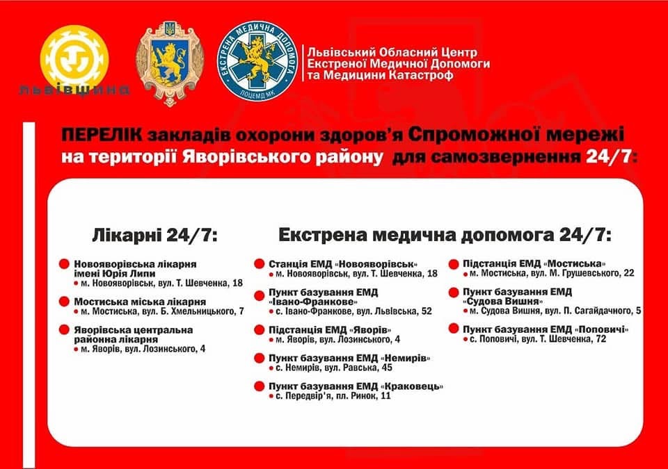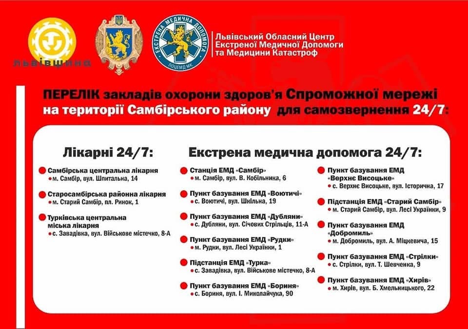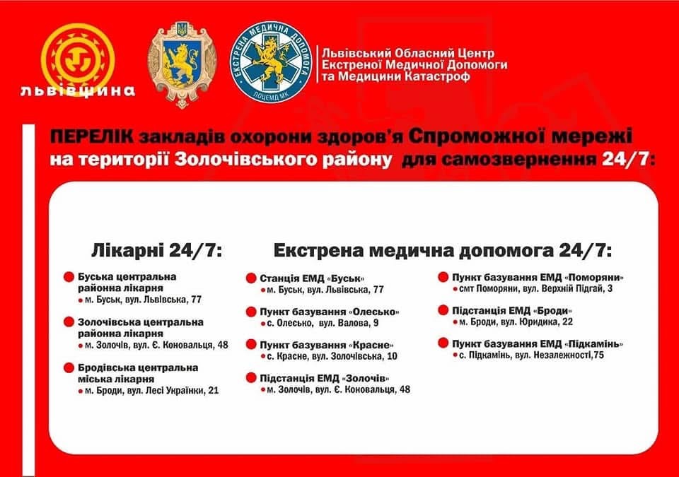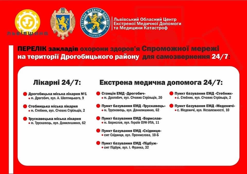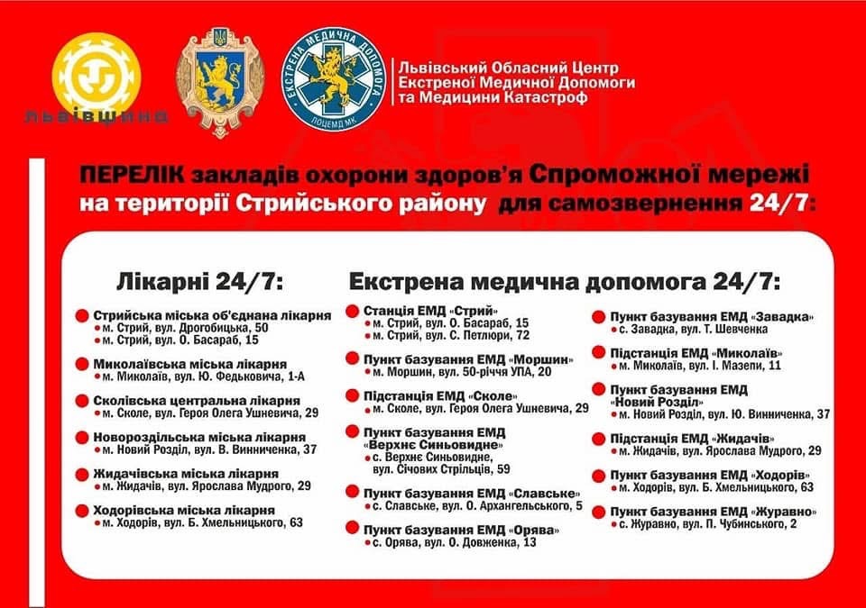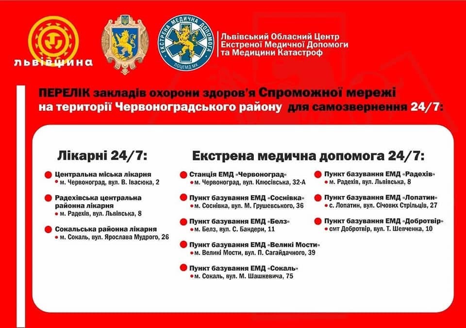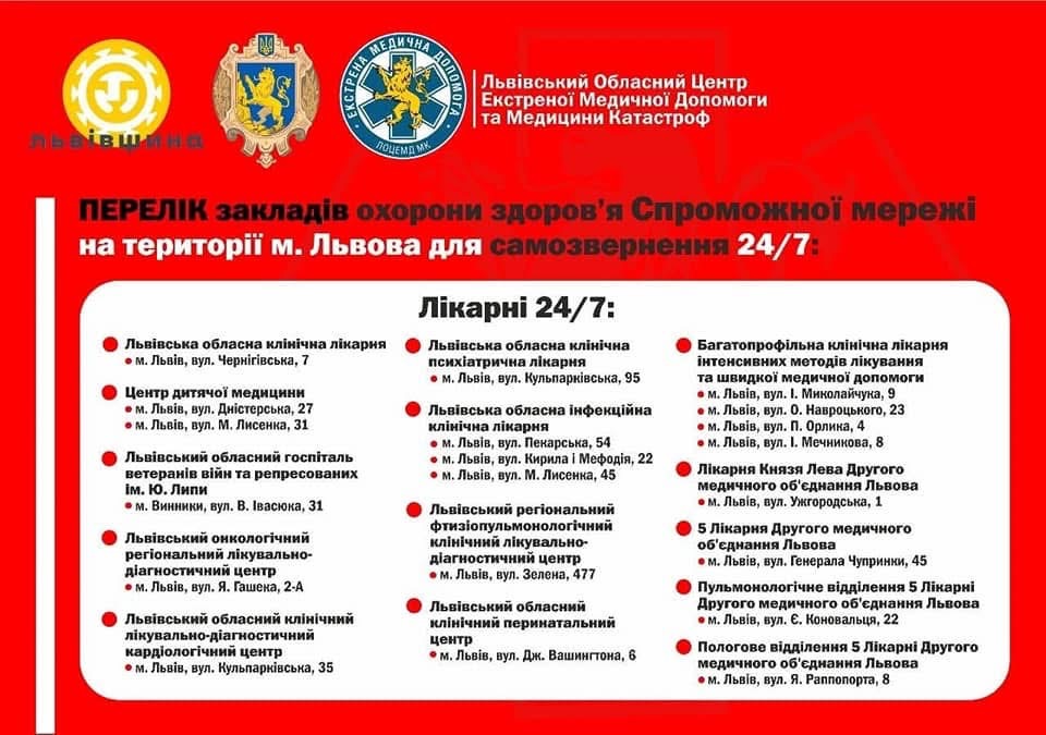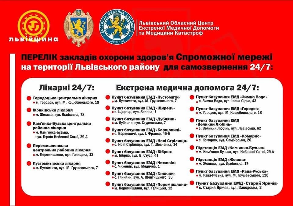 ПРОСИМО НАСЕЛЕННЯ ОБЛАСТІ І ЛЬВОВА тимчасово звертатися за медичною допомогою через самозвернення – за адресами, викладеними нижче, будуть чергувати бригади ЕМД.