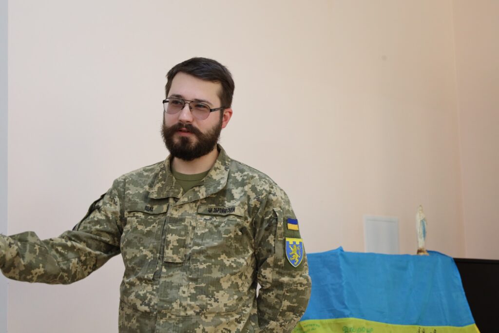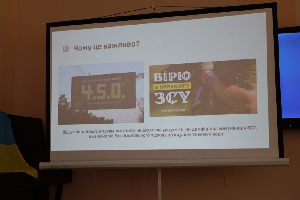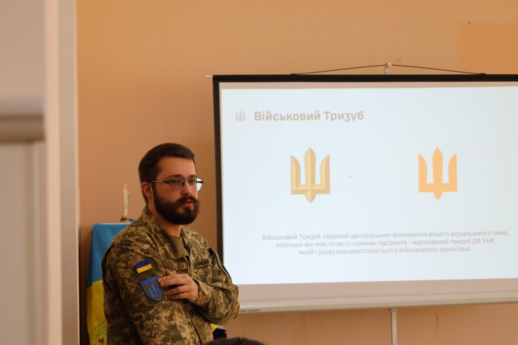 Першим виступив військовослужбовець 103 окремої бригади територіальної оборони, автор і розробник нового графічного стилю Збройних Сил України, який створює графічний контент для сторінки Головнокомандувача ЗСУ Тарас Іщик. Для присутніх він представив презентацію та розповів про створення айдентики, шрифтів, грамот та емблем ЗСУ.