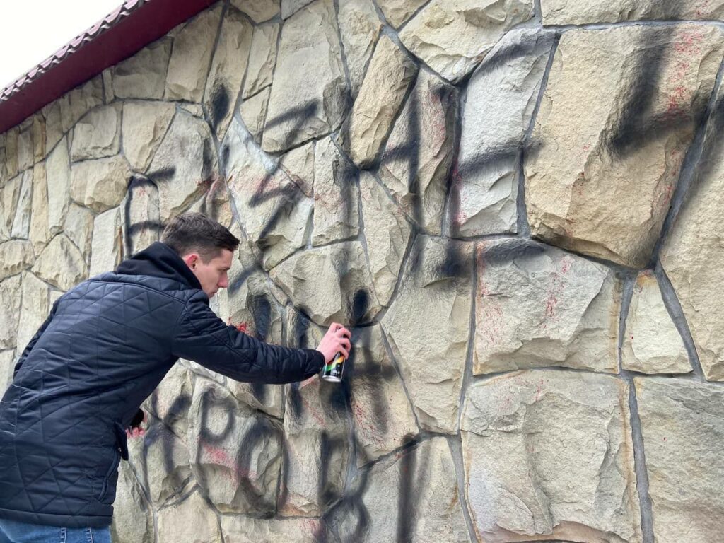 Активісти символічно облили стіни підприємств червоною фарбою, розклеїли інформаційні листівки на фасаді, а також закинули на територію комерційних об’єктів фаєри, димові шашки та петарди.