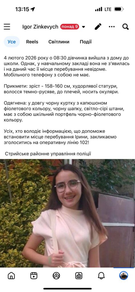 Попередньо встановлено, що 4 лютого 2026 року о 08:30 дівчинка вийшла з дому до школи.