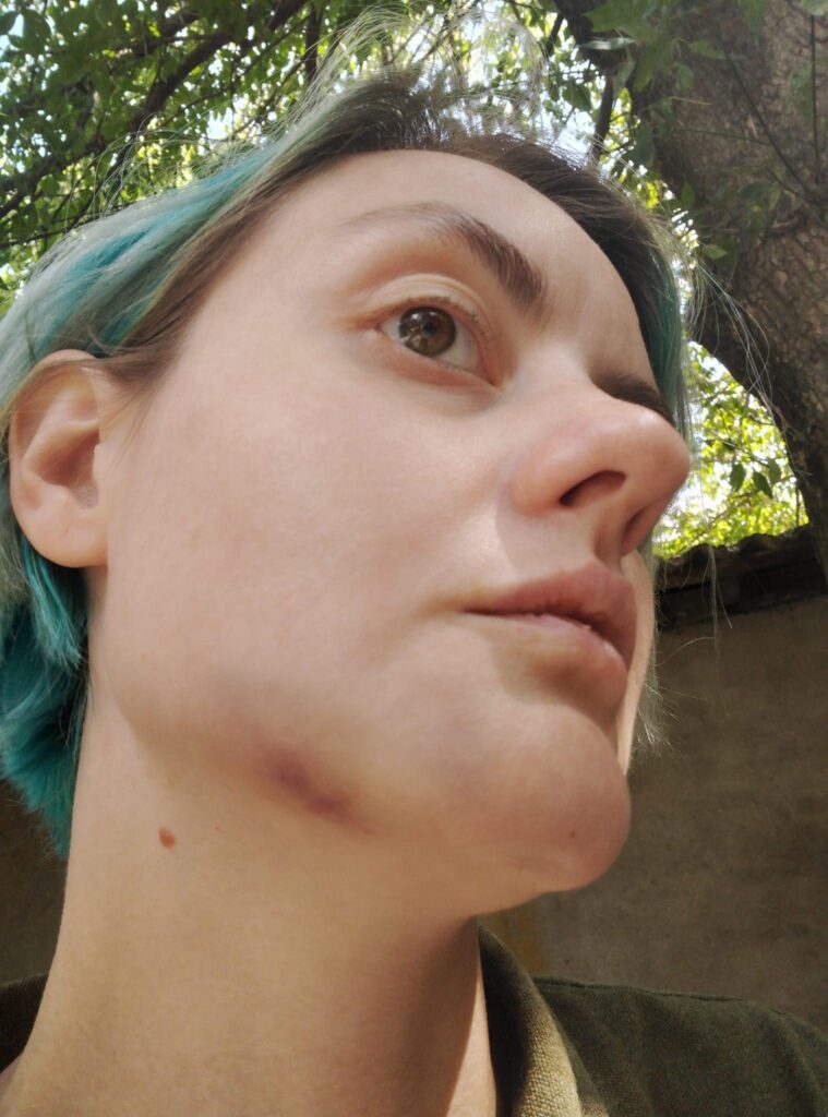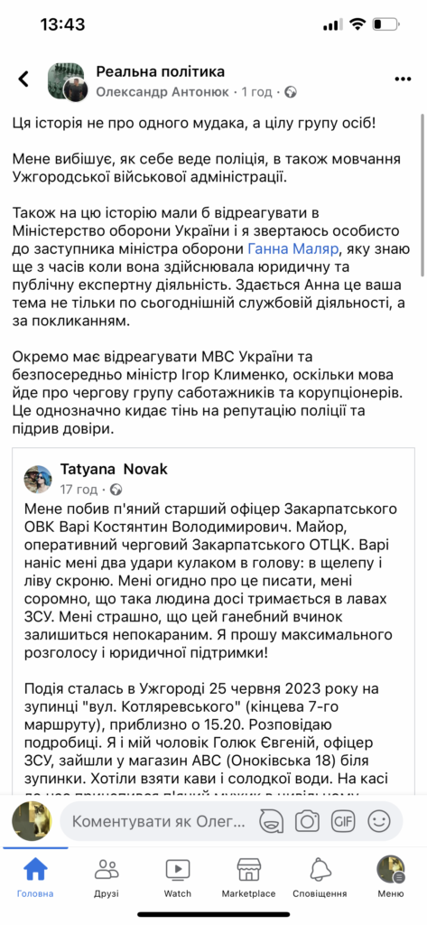 «Мене побив п’яний старший офіцер Закарпатського ОВК Варі Костянтин Володимирович. Майор, оперативний черговий Закарпатського ОТЦК. Варі наніс мені два удари кулаком в голову: в щелепу і ліву скроню. Мені огидно про це писати, мені соромно, що така людина досі тримається в лавах ЗСУ. Мені страшно, що цей ганебний вчинок залишиться непокараним. Я прошу максимального розголосу і юридичної підтримки!», – написала жінка.