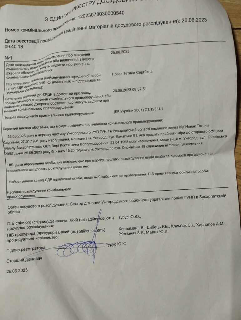 «Згодом приїхала поліція, швидка та ВСП. Варі Костянтина знайшли в його власній квартирі, затримали, «задули» на алкоголь, результат: 2.04 проміле. Швидка констатувала у мене забій щелепи. На місці я написала заяву, я і мій чоловік дали пояснення. Відкрито кримінальне провадження за статтею 125 ч.1 (умисне легке тілесне ушкодження). Ввечері того ж дня в травмпункті Ужгородської міської лікарні в мене зафіксували «забій м’яких тканин голови, забій нижньої щелепи». Наступного ранку, в понеділок, ми з чоловіком поїхали до Ужгородського відділу поліції ГУНП в Закарпатській області. Поки їхали в таксі, мені подзвонили з Закарпатського ОВК і попросили зустрітись, щоб «обсудити інцидент і врегулювати все мирно». Я відмовилась», – додає Тетяна Новак.