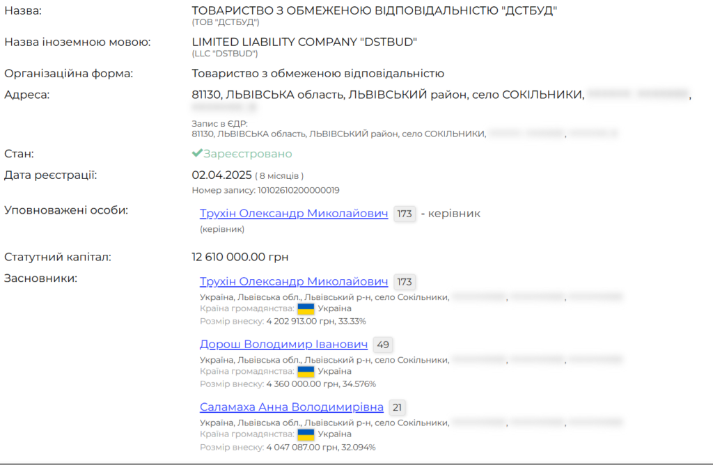Співзасновниками ТОВ «ДСТБуд» – Анна Саламаха, її батько Володимир Дорош та скандальний експдепутат від «Слуги народу» Олександр Трухін. Частка Анни Саламахи в майні «ДСТБуд» становить 32,09%.