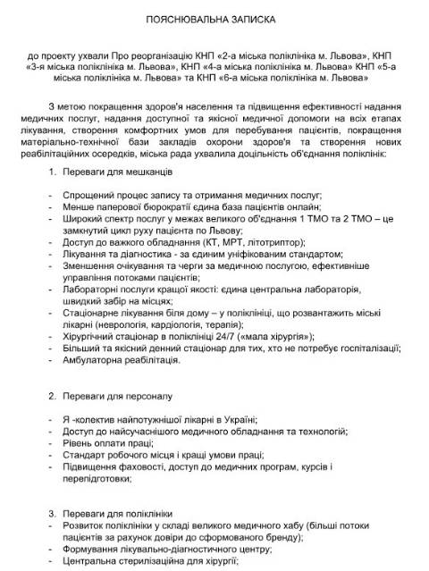 Згідно з документом, поліклініку №2 (на вул. Василя Симоненка, 4), поліклініку №4 (на проспекті Червоної Калини, 68) та поліклініку №6 (на вул. Медової Печери, 1) планують приєднати до КНП “Львівське територіальне медичне об’єднання “Багатопрофільна клінічна лікарня інтенсивних методів лікування та швидкої медичної допомоги” (ТМО №1).