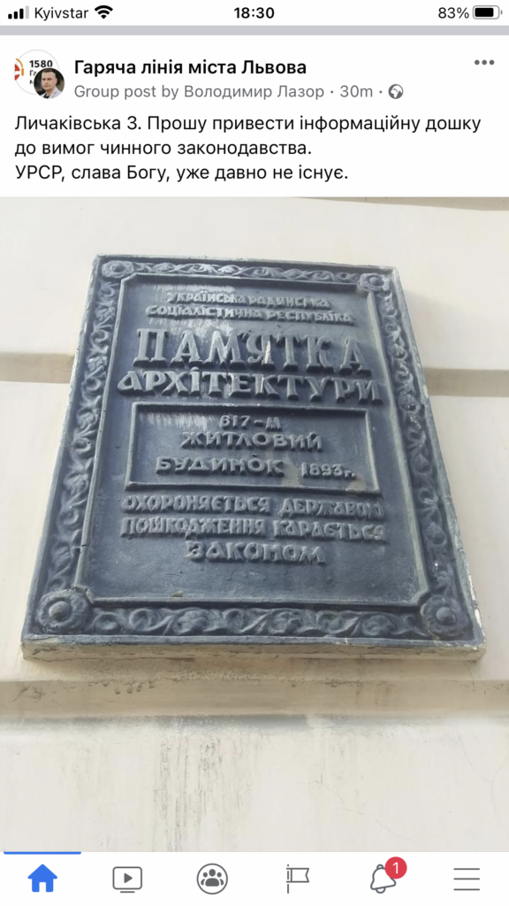 “Личаківська 3. Прошу привести інформаційну дошку до вимог чинного законодавства. УРСР, слава Богу, уже давно не існує”, – йдеться у повідомленні.