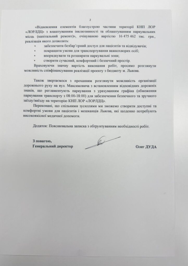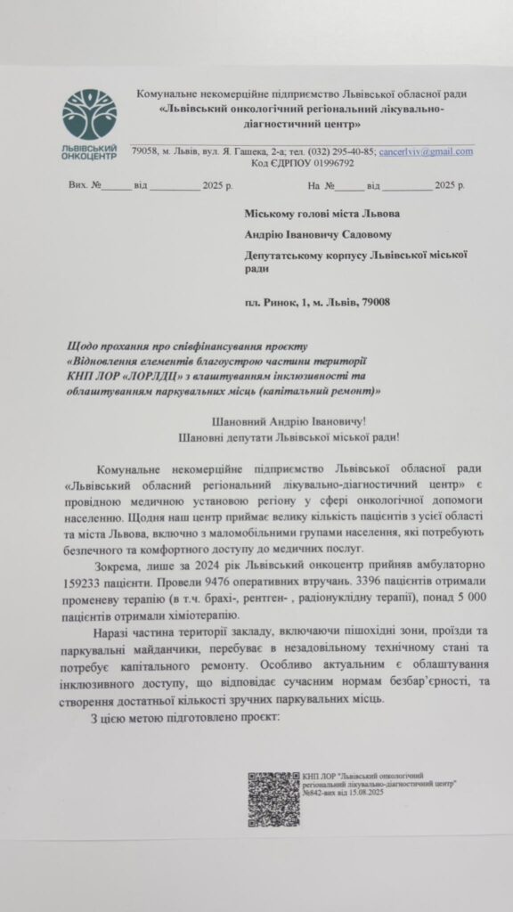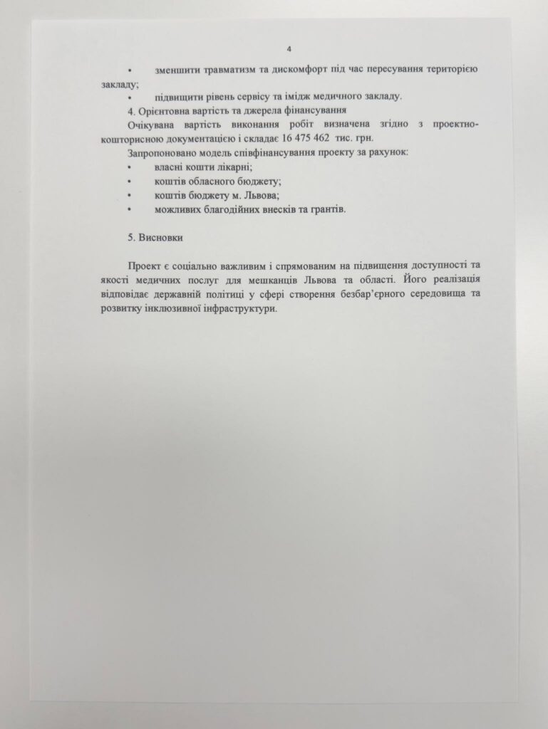 Тому на найближчий час у наших планах є продовжити відновлення елементів благоустрою частини території лікарні з влаштуванням інклюзивності та облаштуванням паркувальних місць. Часто люди приїздять на лікування здалеку і нам дуже завжливо забезпечити їм максимально комфортні умови, особливо у цей важкий та тривожний для нашої країни час. Ми налаштовані на подальшу співпрацю з міською владою та сподіваємось на підтримку таких важливих для лікарні проєктів. Відповідне звернення скерували до Львівської міської ради з прохання долучення до проєкту «Відновлення елементів