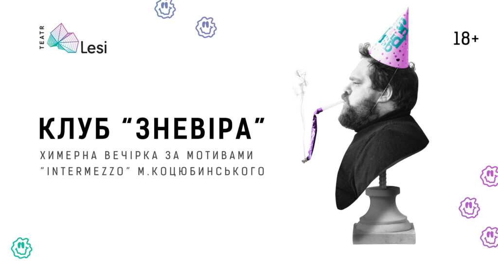 11, 12 та 25 листопада Театр Лесі презентує ПРЕМ’ЄРУ “Клуб “Зневіра”, химерну вечірку за мотивами ”Intermezzo” М. Коцюбинського. Це дебютна постановка режисера Владислава Білоненка на малій сцені театру. Над сценографією працював головний художник Олексій Хорошко, над костюмами – художниця з костюмів Марія Антоняк.