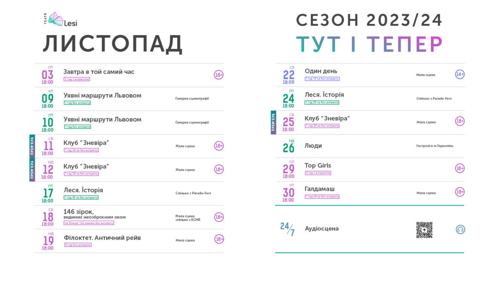 На кінець осені Львівський Театр Лесі Українки підготував насичений репертуар, до якого увійшли 14 непересічних вистав, серед яких прем’єра нової постановки, довгоочікуване повернення вистави-переможниці престижного театрального фестивалю-премії, показ байопіку від відомої сербської режисерки та багато іншого.