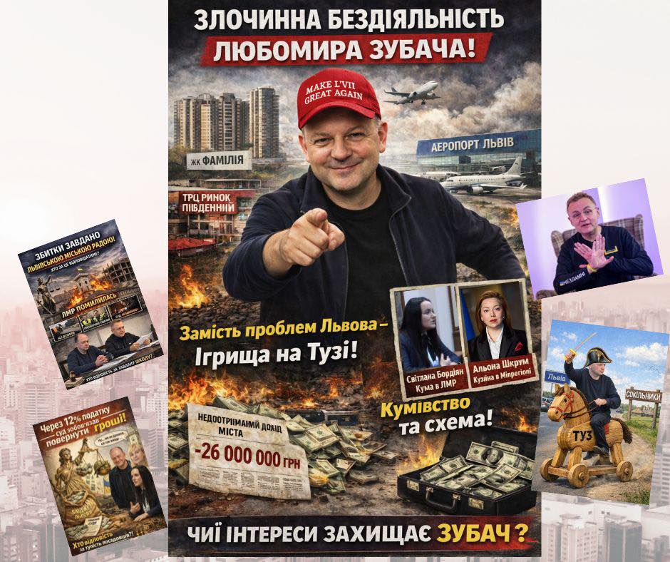 Замість того щоб займатися реальними проблемами Львова, боротися з хаотичною забудовою міста та тотальним знищенням виробництва, Зубач на «Тузі», натягнувши червону кепку, на хвилинку уявив себе Трампом і пішов в атаку на Сокільники.