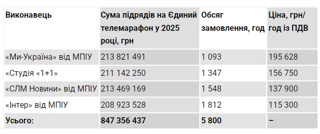 У березні з телеканалами уклали чотири угоди на створення контенту для марафону «Єдині новини #UAразом» в 2025 році на 738 млн грн. Тепер їм дозамовили послуги на листопад-грудень на 109 млн грн. Вартість нових договорів складає від 24 до 29 млн грн. Усередині прописано різний обсяг оплачуваного контенту, відтак ціни за годину різняться. Вони не змінились порівняно з первинними угодами, про які «Наші гроші» повідомляли навесні.