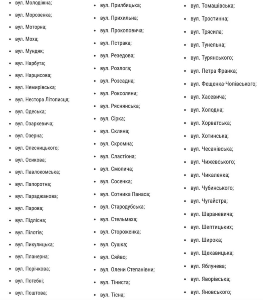 • вул. Городоцька, 2, 8, 18, 20, 26, 29, 32, 36, 38, 49, 64, 83, 8890, 112, 126, 128, 129, 132, 139, 155, 157, 160, 168а, 172, 174, 176, 178, 179, 186, 195, 205, 222, 226, 226а, 230, 234б, 238а, 241а, 256, 283, 286, 288, 299, 318, 355, 359, 367, 370;