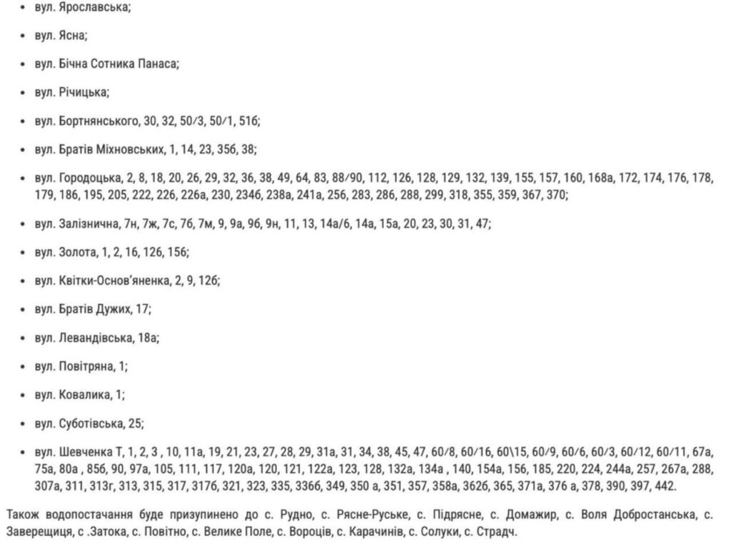 Також водопостачання буде призупинено до с. Рудно, с. Рясне-Руське, с. Підрясне, с. Домажир, с. Воля Добростанська, с. Заверещиця, с .Затока, с. Повітно, с. Велике Поле, с. Вороців, с. Карачинів, с. Солуки, с. Страдч.