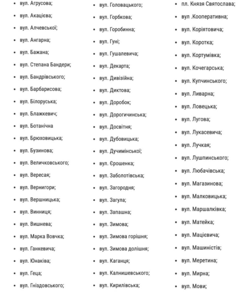 • вул. Шевченка Т, 1, 2, 3 , 10, 11а, 19, 21, 23, 27, 28, 29, 31а, 31, 34, 38, 45, 47, 6086016, 60\15, 60960660360126011, 67а, 75а, 80а , 85б, 90, 97а, 105, 111, 117, 120а, 120, 121, 122а, 123, 128, 132а, 134а , 140, 154а, 156, 185, 220, 224, 244а, 257, 267а, 288, 307а, 311, 313г, 313, 315, 317, 317б, 321, 323, 335, 336б, 349, 350 а, 351, 357, 358а, 362б, 365, 371а, 376 а, 378, 390, 397, 442.