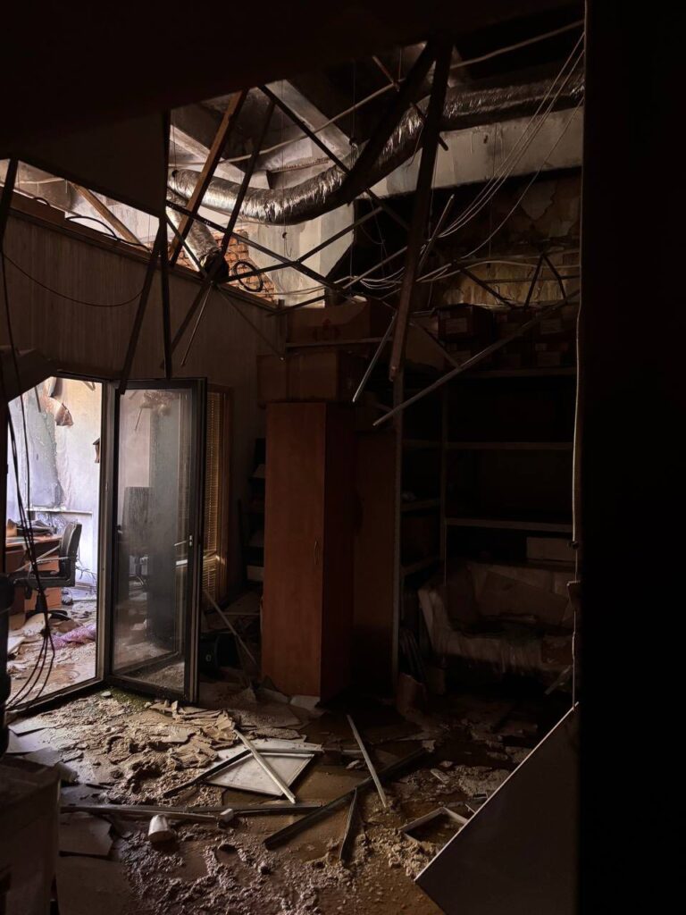 Ось так виглядає частина нашого робочого простору після «руського міра». Вибухова хвиля та уламки суттєво зруйнували фасад будівлі: вибито всі вікна, пошкоджено перекриття, обвалилася частина стін, є руйнування всередині приміщень складу та кабінету. Внаслідок обстрілу та гасіння пожежі частину книжок пошкоджено.
