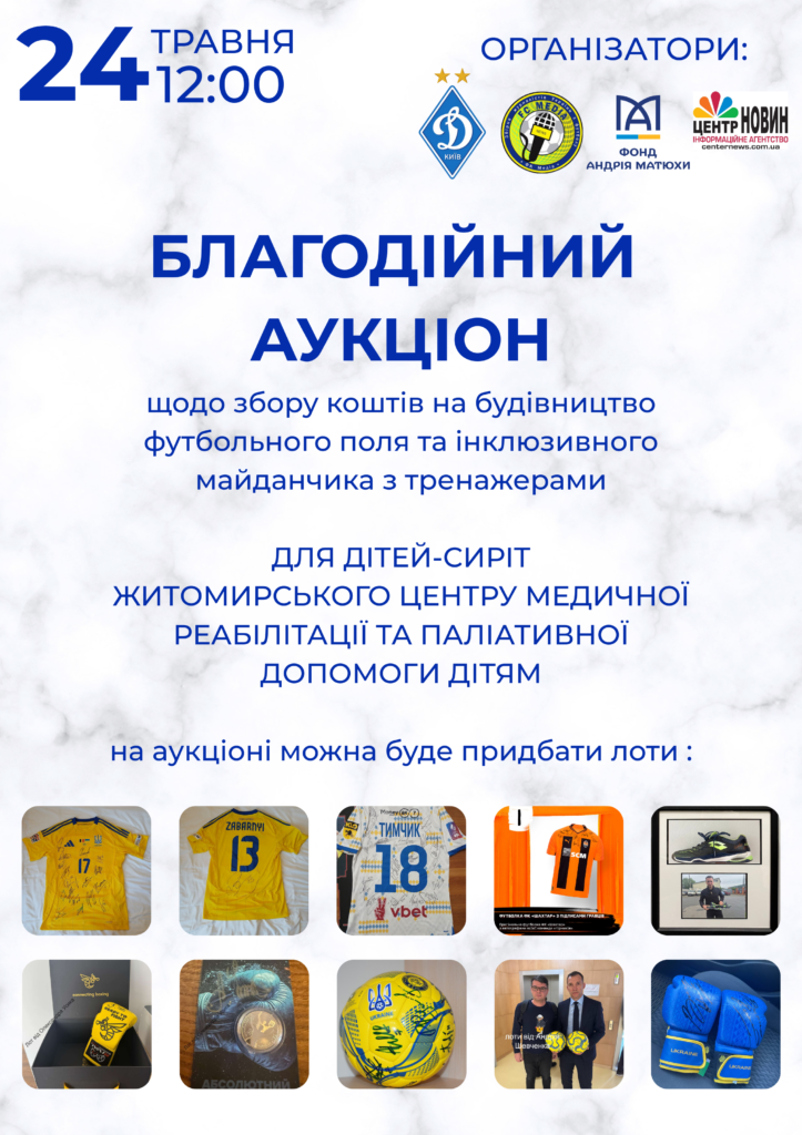 Усі виручені кошти з аукціону, організатори спрямують на будівництво футбольного поля та дитячо-спортивного майданчика з інклюзивними тренажерами для дітей-сиріт Житомирського будинку дитини (Центр медичної реабілітації та паліативної допомоги дітям).