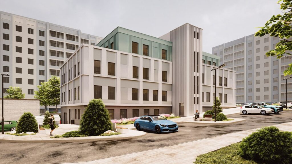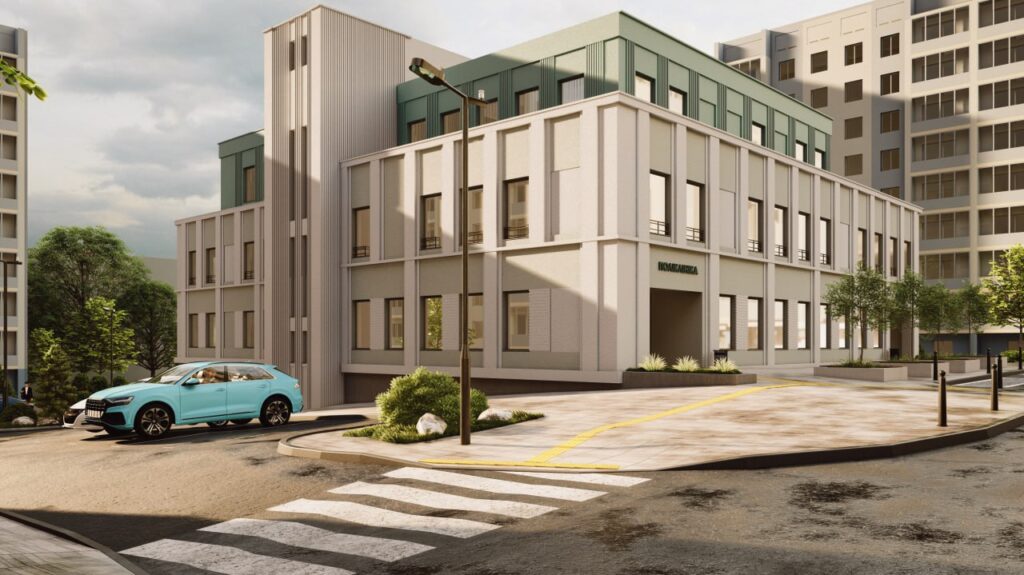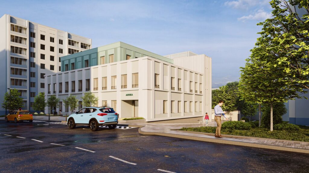 Фасад вирішили зробити більш сучасним, але водночас стриманим. За основу взяли фасадну сітку попереднього об’єкта — з акцентами у вигляді сходового майданчика і розділення вікон. Це дозволило зберегти певну “спадкоємність архітектури”, але у простішому, більш функціональному стилі, притаманному медичним закладам.