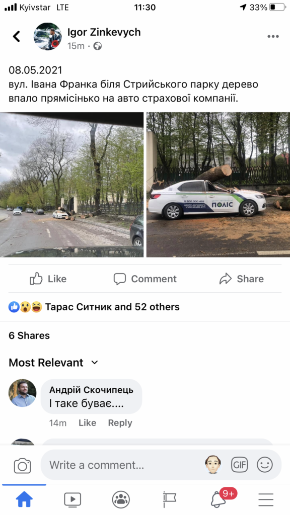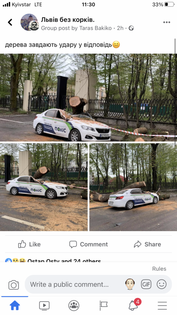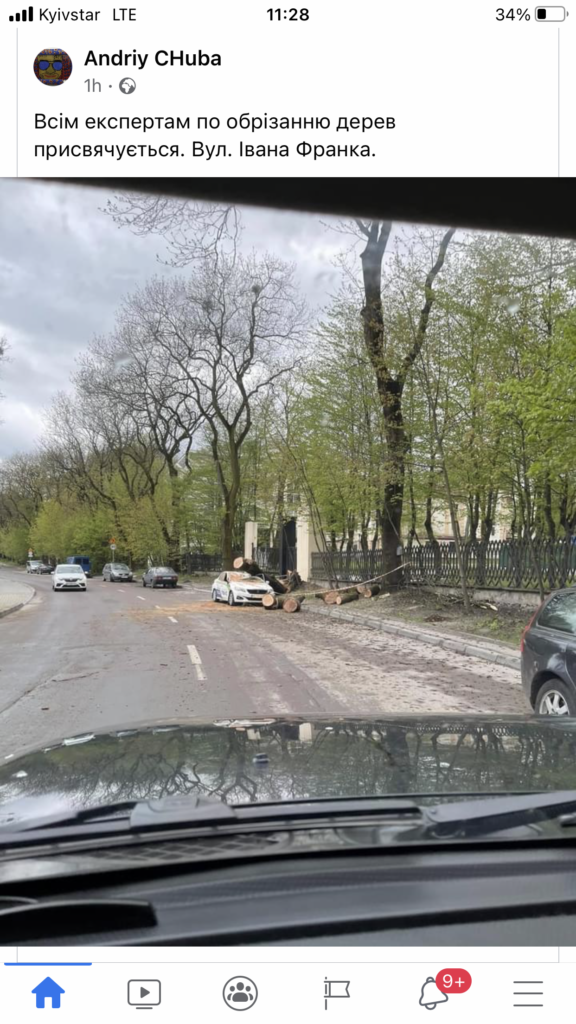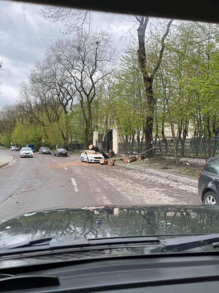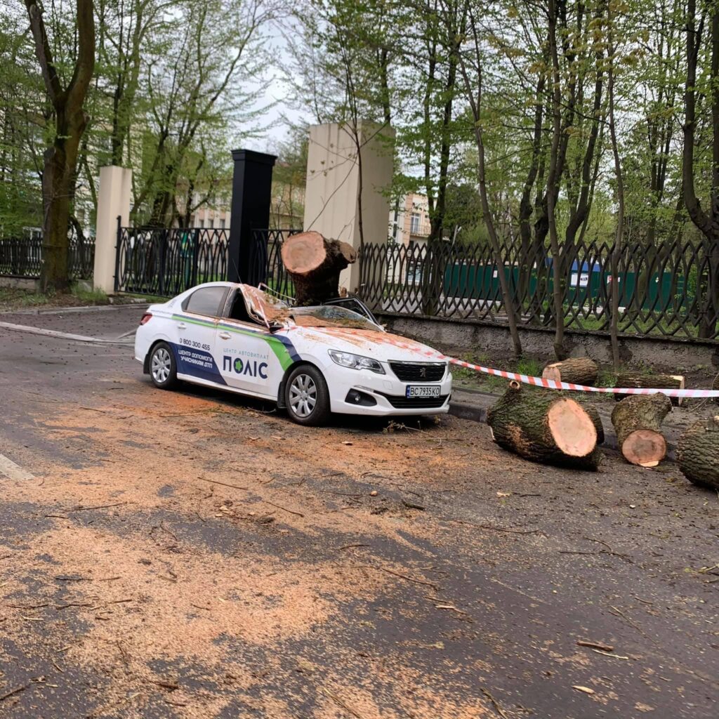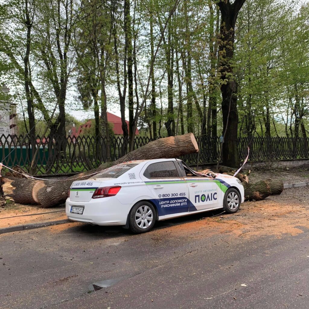 Як йдеться у повдіомленні, дерево впало на автомобіль страхової компанії на вулиці Івана Франка біля Стрийського парку.