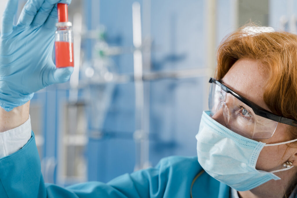 Female medical or scientific researcher or woman doctor looking at a test tube of clear solution in a laboratory.