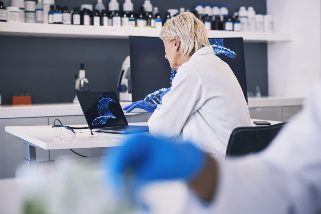 Scientist, computer screen and DNA research, genetics analysis and study in medical laboratory. Doctor or woman on laptop for virus, vaccine and genes results, solution and science for healthcare.